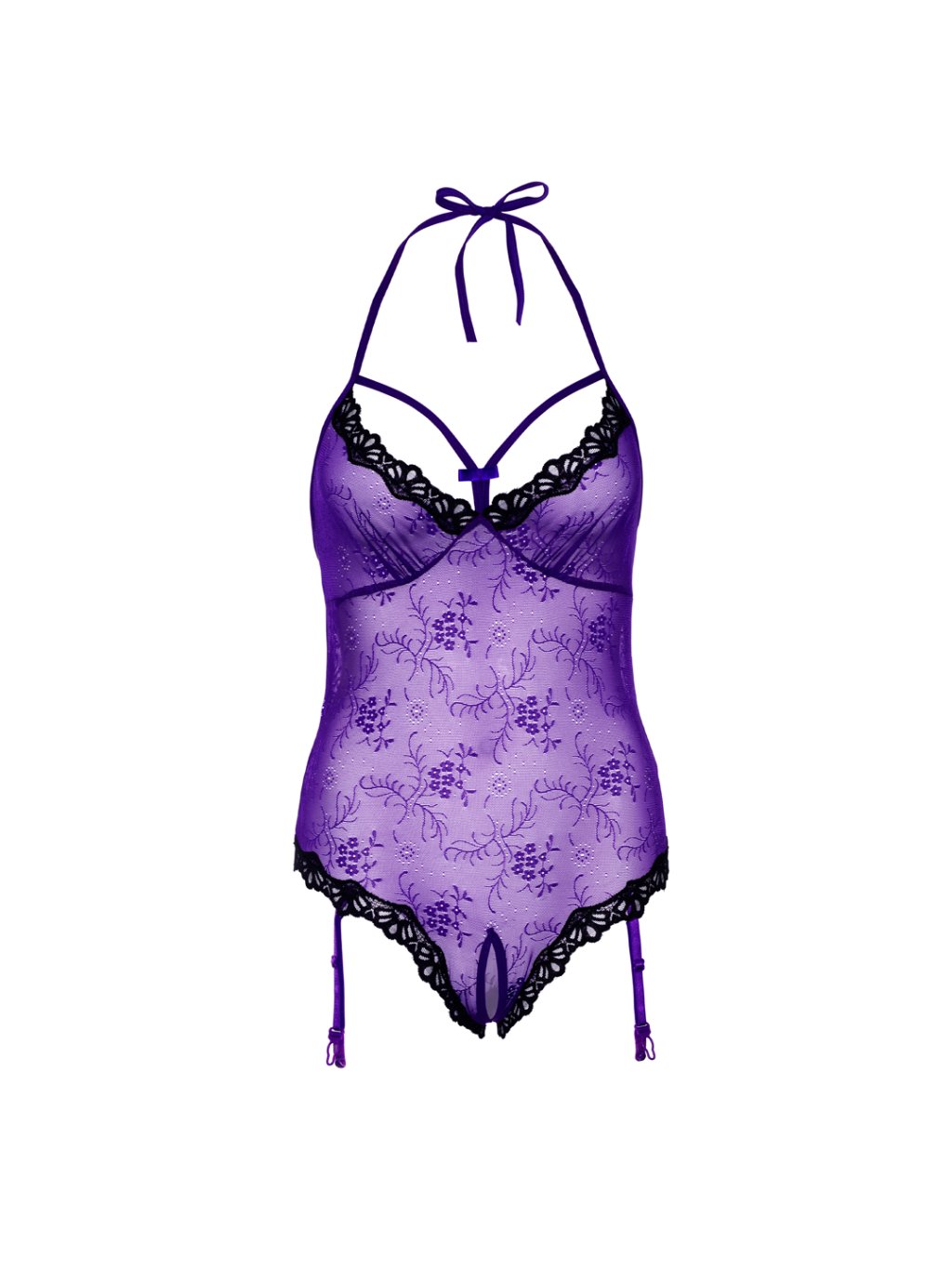 Fialové body z pružné látky s květinovým vzorem a podvazky.Materiál: