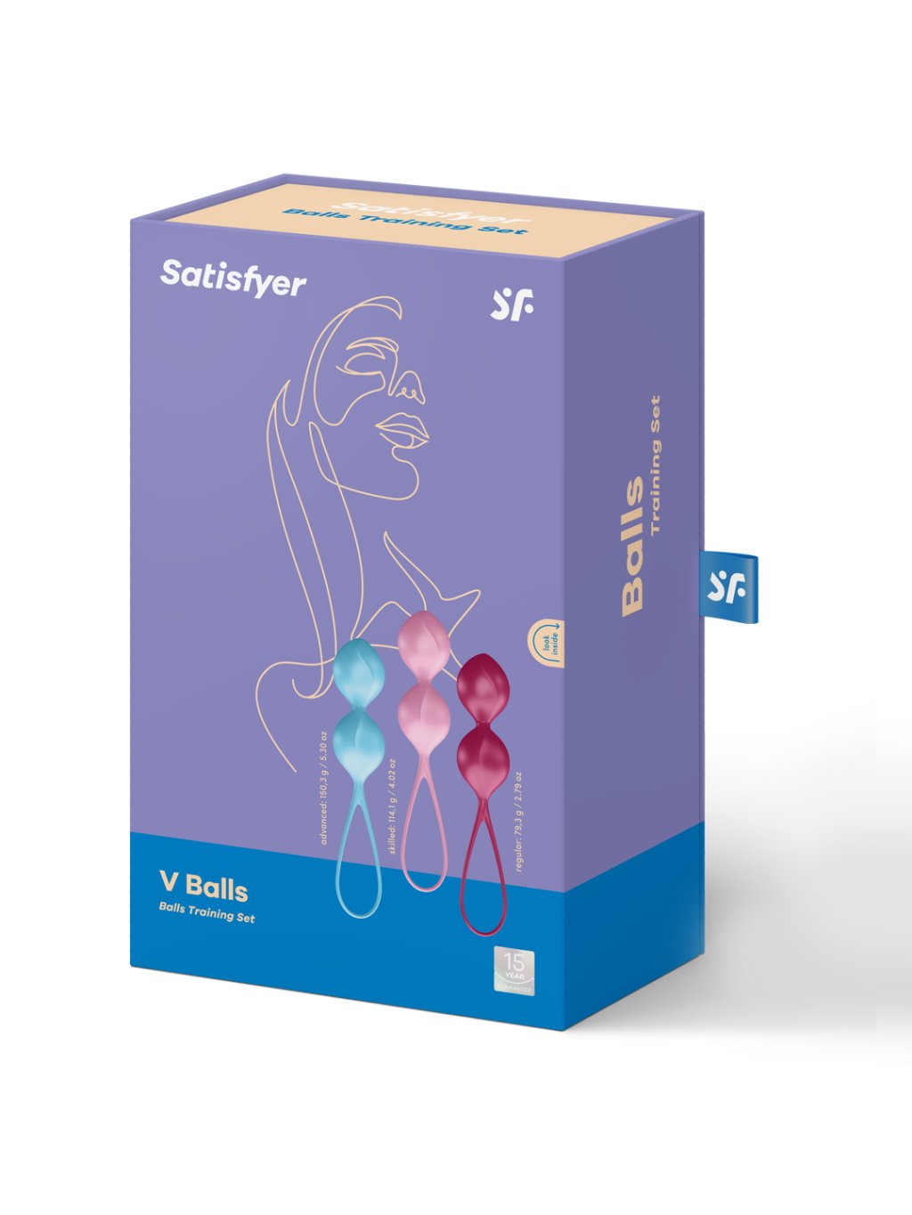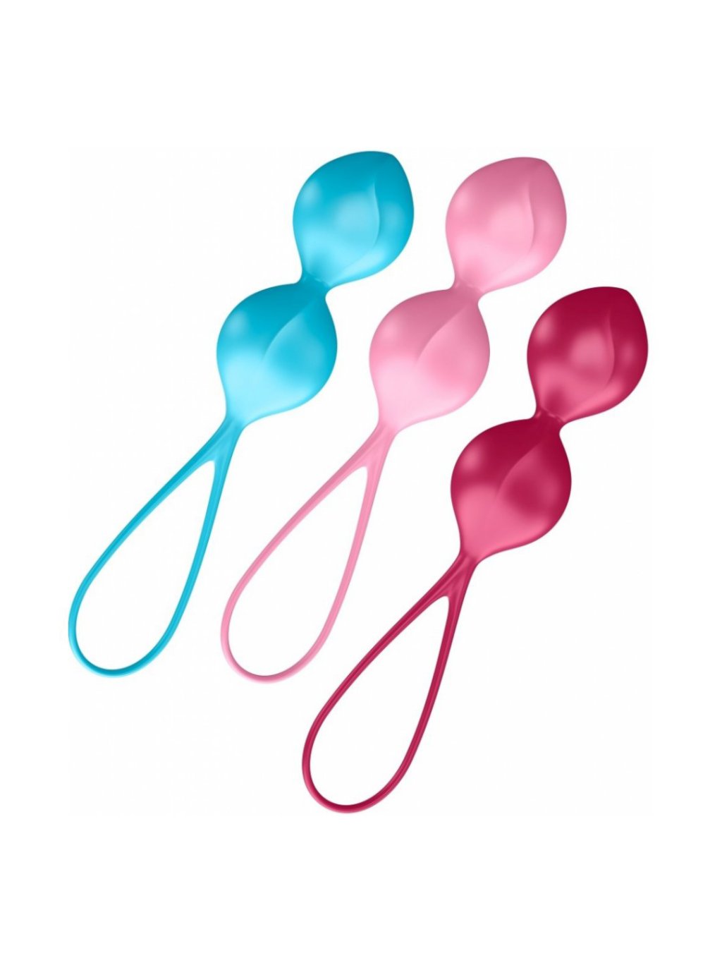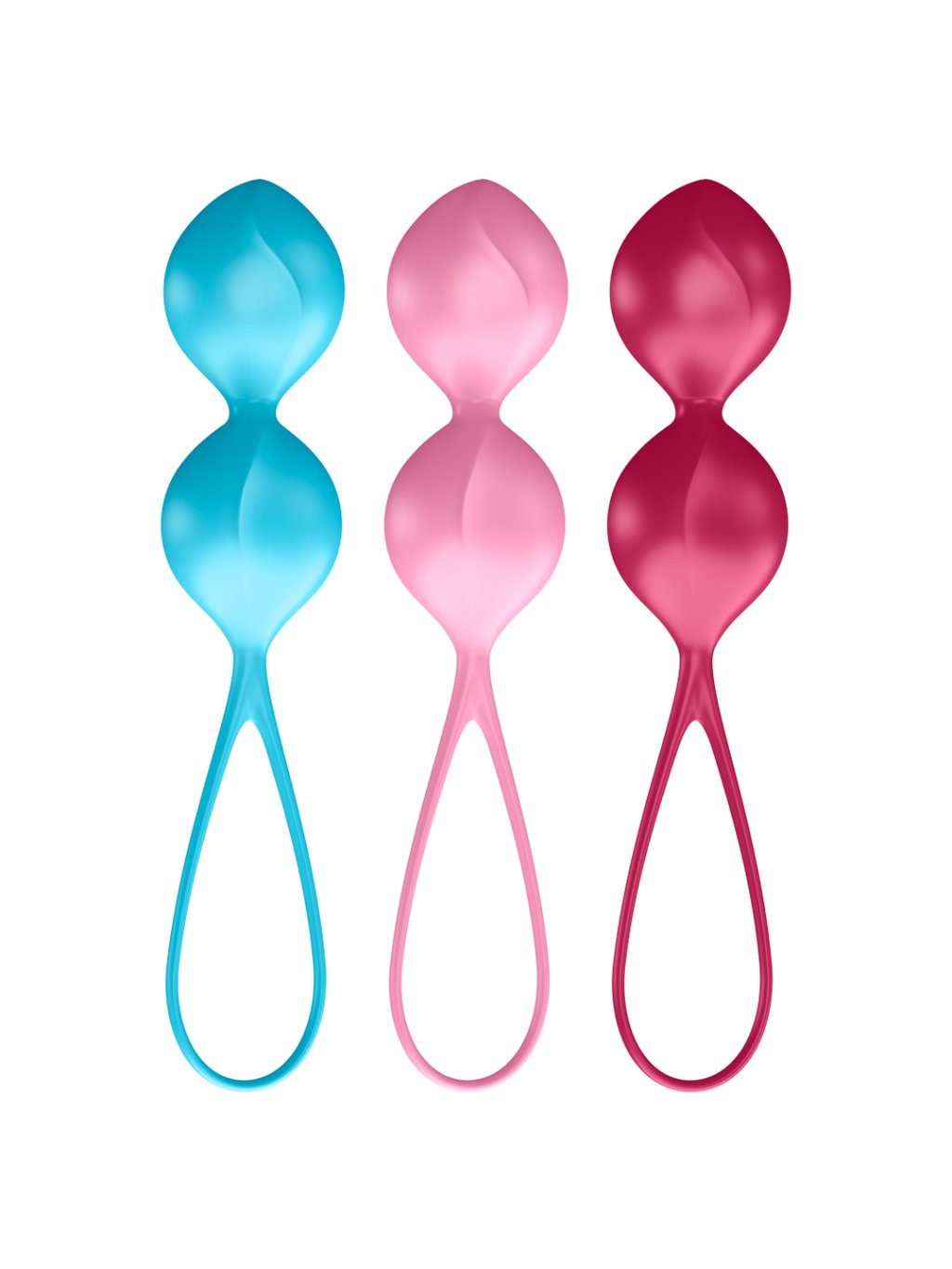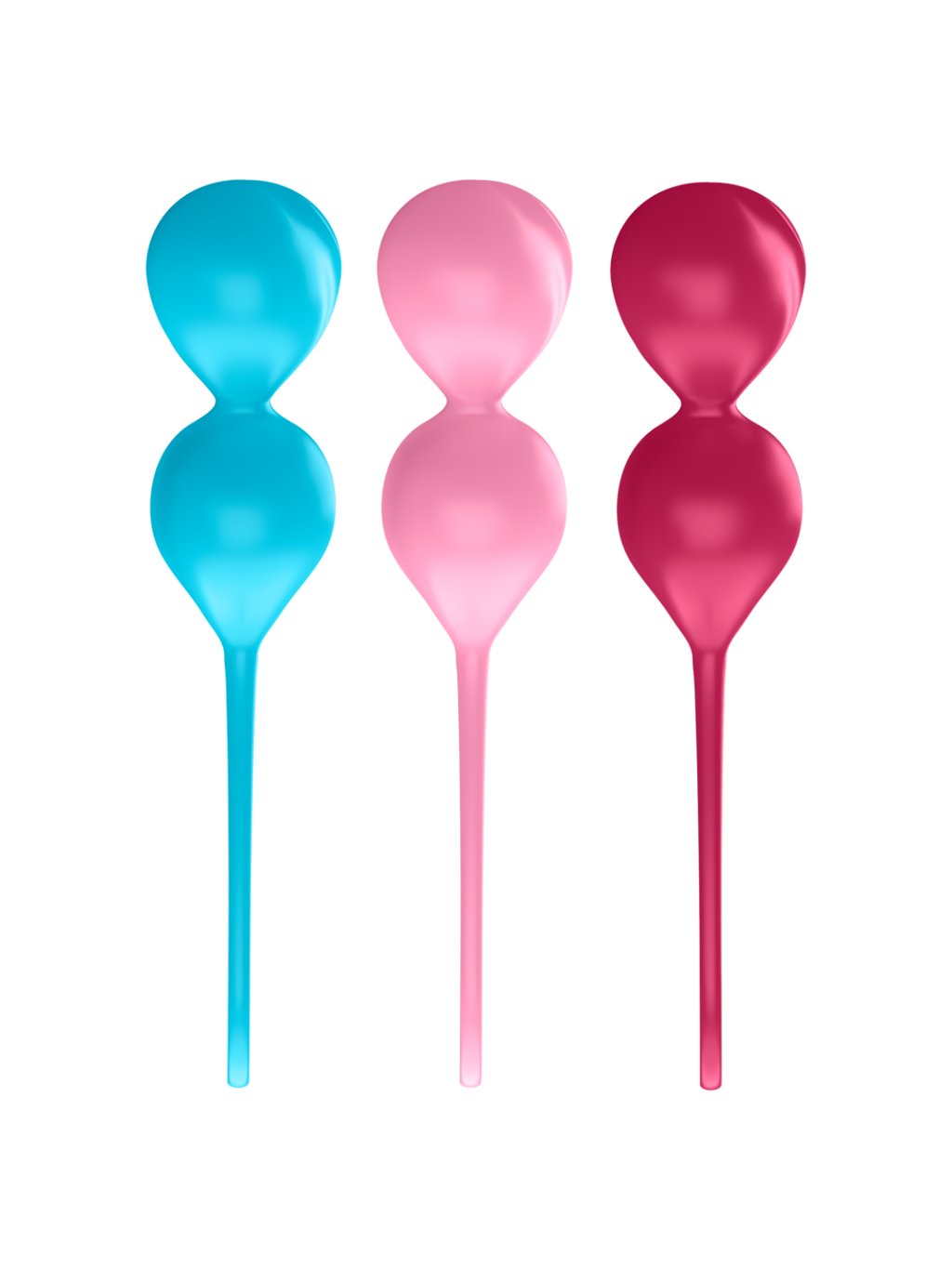 Sada Satisfyer Balls Double obsahuje tři váhově odlišné dvojkuličky s poutkem pro snadnou manipulaci.Rozměry a vlastnosti